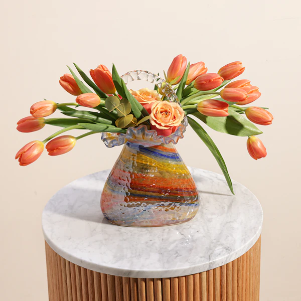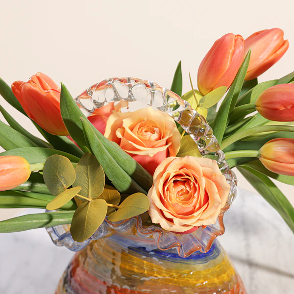 احتفلوا بأعياد الميلاد بطريقة مميزة مع هديتنا الرائعة تحتوي باقة الأزهار على توليب برتقالي وجوري شيري براندي، جميعها مقدمة في مزهرية زجاجية أنيقة. يزينها عود تزيين يحمل رسالة عيد ميلاد سعيد، ليضفي لمسة من الفرح والجمال على هذه المناسبة الخاصة. اجعلوا عيد ميلاد أحبائكم لحظة لا تُنسى مع هذه الهدية الساحرة اطلب الان.