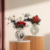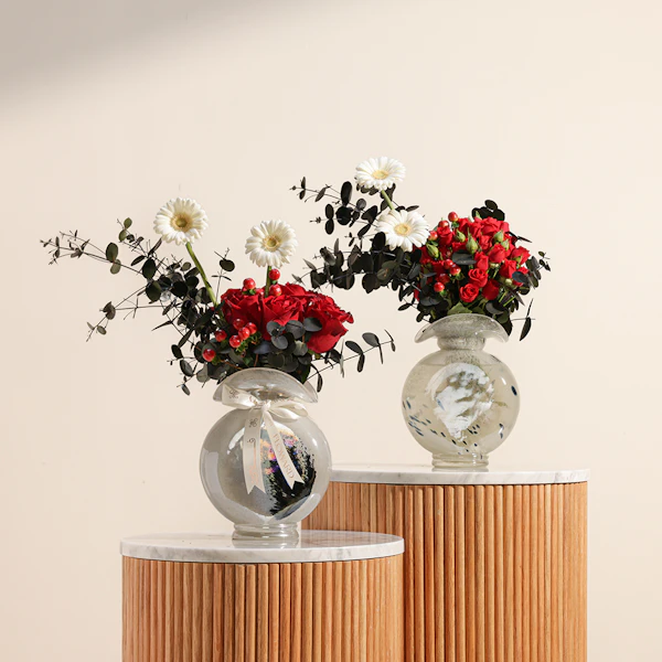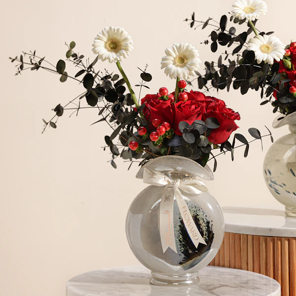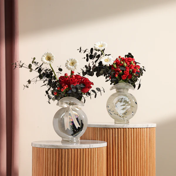 قم بتحويل أي مساحة مع مجموعتنا ثنائي الأناقة الزهرية وهي عبارة عن ترتيب جذاب من أزهار الجوري البيبي جوري الحمراء يضيف اللون الأبيض النقي للجيربيرا والهابيريكوم الأحمر النابض بالحياة تباينًا مذهلاً، بينما يوفر الأوكالبتوس المهدئ لمسة منعشة. يتم تقديم هذه الهدية في مزهريتين زجاجيتين أنيقتين، وهي مثالية للاحتفال بالحب أو الاحتفال بالأحداث المهمة أو تفتيح يوم شخص ما بألوانها الغنية والديناميكية وتصميمها الأنيق. سواء لمناسبة خاصة أو لمجرد ذلك، فإن هذه المجموعة تشع بالرقي والسحر الصادق.