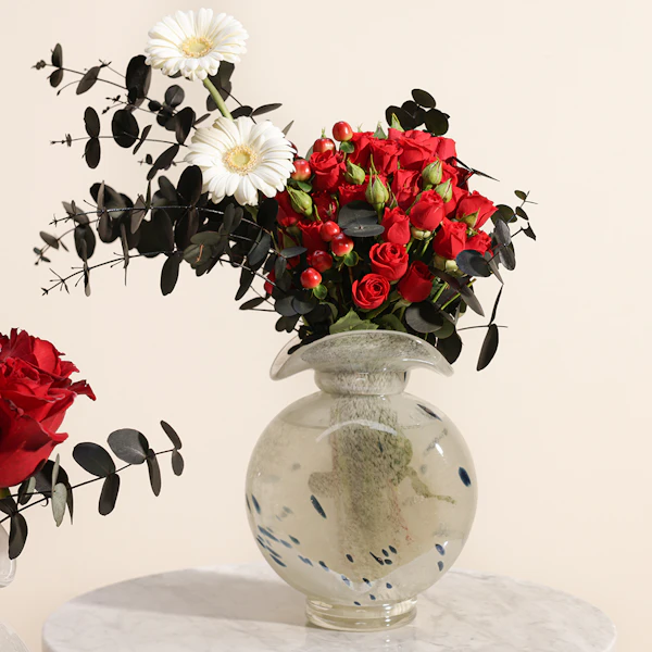 QAR400قم بتحويل أي مساحة مع مجموعتنا ثنائي الأناقة الزهرية وهي عبارة عن ترتيب جذاب من أزهار الجوري البيبي جوري الحمراء يضيف اللون الأبيض النقي للجيربيرا والهابيريكوم الأحمر النابض بالحياة تباينًا مذهلاً، بينما يوفر الأوكالبتوس المهدئ لمسة منعشة. يتم تقديم هذه الهدية في مزهريتين زجاجيتين أنيقتين، وهي مثالية للاحتفال بالحب أو الاحتفال بالأحداث المهمة أو تفتيح يوم شخص ما بألوانها الغنية والديناميكية وتصميمها الأنيق. سواء لمناسبة خاصة أو لمجرد ذلك، فإن هذه المجموعة تشع بالرقي والسحر الصادق.
