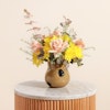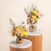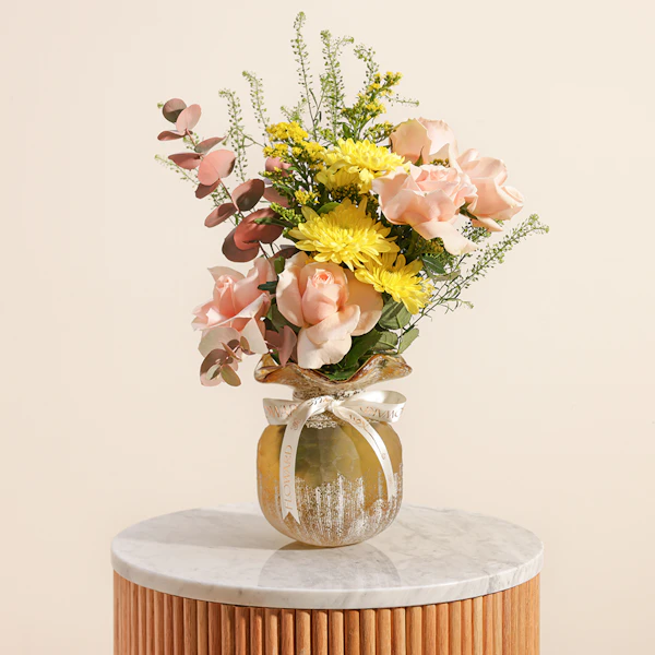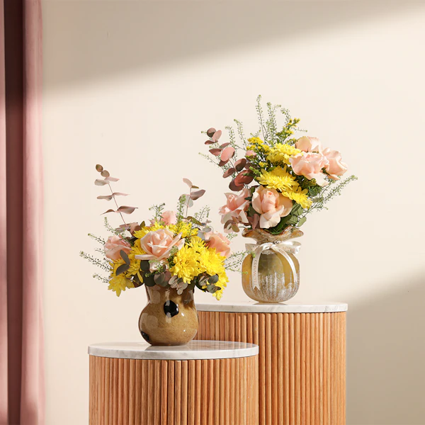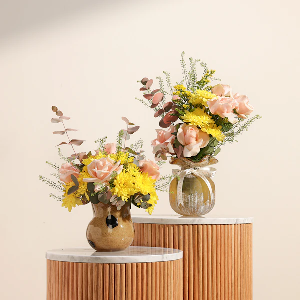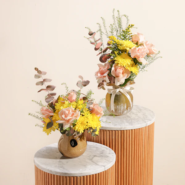 أضف لمسة من الرقي إلى أي مساحة مع ثنائي مزهريات هدوء الشمس وهي عبارة عن تناغم مثالي بين ورود الجوري ذات اللون الخوخي الرقيق وزهور الأقحوان الصفراء المشرقة. كما يضيف الأوكالبتوس المهدئ لمسة منعشة، مما يجعل هذه الهدية مثالية لأي مناسبة. تُقدم هذه المجموعة المنسقة في مزهريتين زجاجيتين أنيقتين، وتجلب دفقة من أشعة الشمس والهدوء إلى منازل أحبائك. سواء كنت تحتفل بحدث مهم أو ببساطة تضيء يوم شخص ما، فإن هذه المجموعة تشع بالسحر والبهجة، وتجسد الجمال والروعة في أجمل صورها.