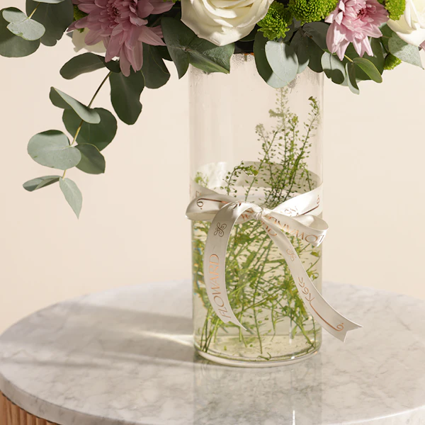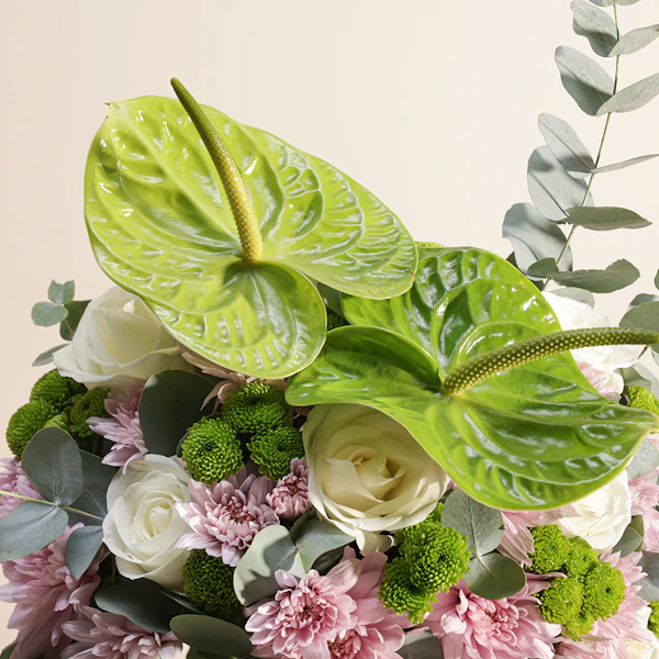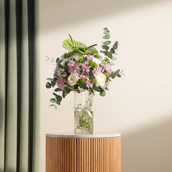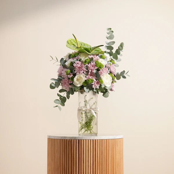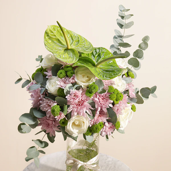 اجعل لحظاتك أكثر إشراقًا وجمالًا مع هذه الهدية الرائعة. مزهرية زجاجية أنيقة تحتوي على تشكيلة زهور ساحرة تجمع بين زهور الجوري الأبيض الفاخرة، والأقحوان الوردي الرقيق، والأقحوان الأخضر المنعش، مع لمسة من الأنثوريوم الأخضر الذي يضفي طابعًا من التميز والأناقة.هذه المزهرية المثالية ليست مجرد إضافة جميلة للديكور، بل هي تعبير عن الحب والاهتمام. سواء كنت تبحث عن هدية رائعة للاحتفال بمناسبة خاصة أو لتزيين منزلك، فإن هذه التوليفة من الزهور تعكس ذوقًا راقيًا وحسًا فنيًا لا يُضاهى.اطلب أحلى هدية الآن واجعل من تقدمها له يشعر بالفرح والسعادة في كل مرة ينظر إليها. إنها هدية تجمع بين الجمال والطبيعة في تناغم رائع لا يُنسى.