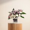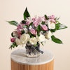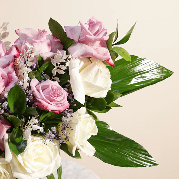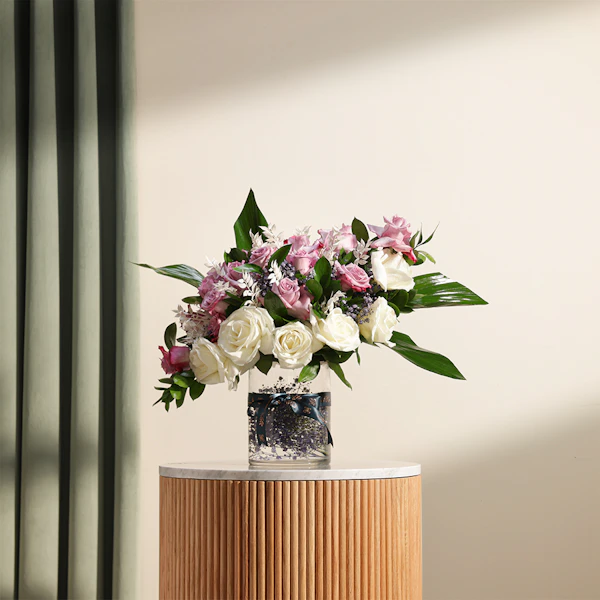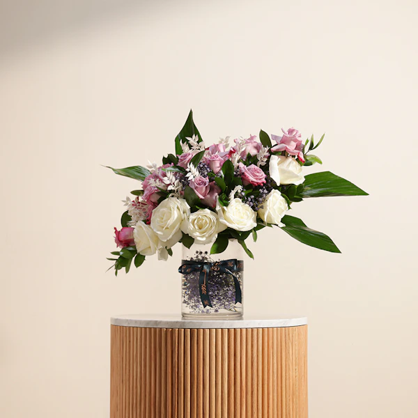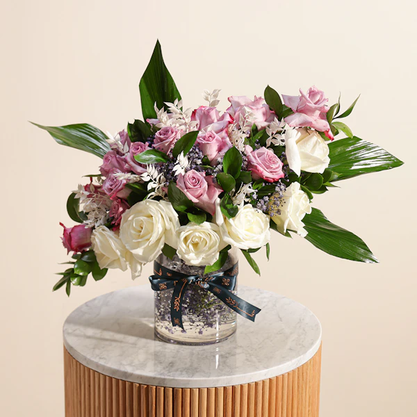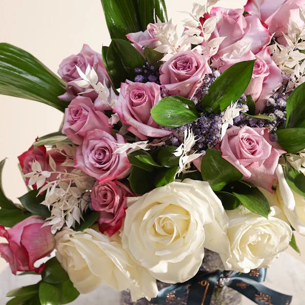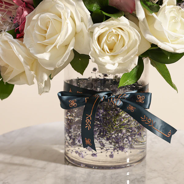 اكشف عن الجمال الخالد مع باقة السحرالملكي الخاصة بنا. تتميز هذه الباقة المذهلة باللون الأرجواني الملكي والأبيض الكلاسيكي للجوري مع إضافة زهور الجبسوفيلا الرقيقة و روسكوس المجفف الأنيق و روسكوس أخضر لإضافة المزيد من الملمس مع لمسة من أوراق الأسبيدسترا الرائع ويتم تقديمها في مزهرية زجاجية أنيقة، وهي تنضح بالرقي والرشاقة. مثالية للاحتفال بالمناسبات الخاصة أو إضافة لمسة من الرقي إلى أي مساحة، تم تصميم باقة سحر ملكي لترك انطباع دائم بمزيجها المتناغم من الألوان والملمس. قدم هدية الأناقة والسحر اليوم.