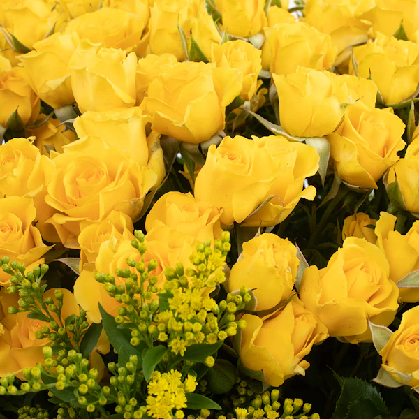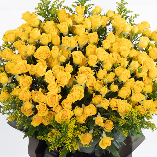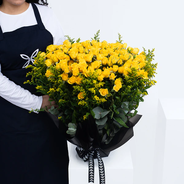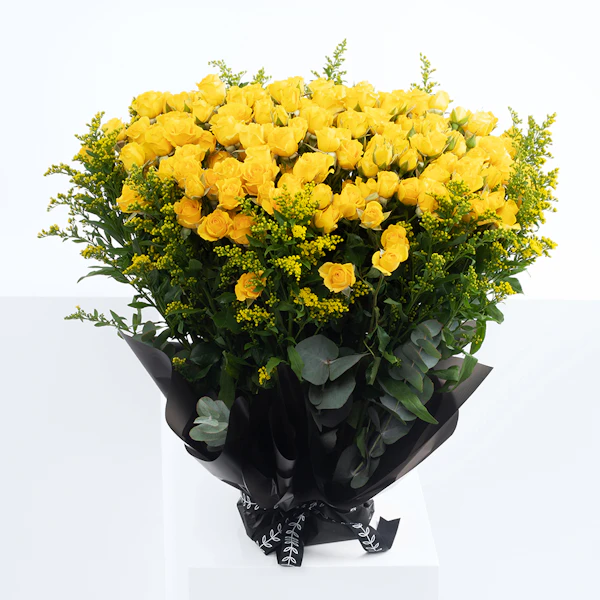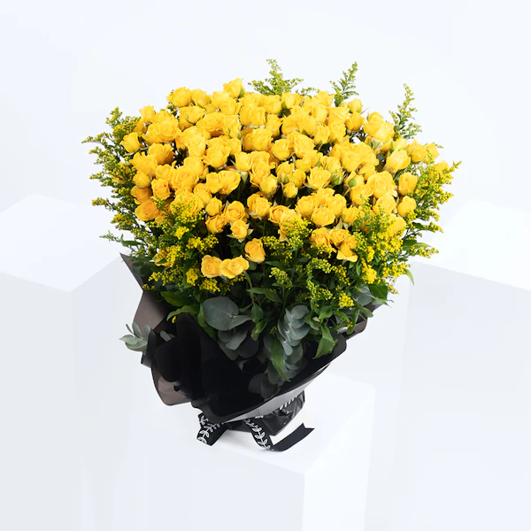 اكشف عن مشاعرك بهذه الباقة اللامعة المنسقة من البيبي جوري الاصفروالسوليداجو. بوكيه زهور طبيعية تكتب بألوانها وأشكالها المميزة رسائل جميلة عن الحب، والصداقة، والجمال. هذا البوكيه يتميز بزهوره الفائقة الجمال التي تترك آثر جميل في نفس من تهتم لأمره. كما أنه ملفوف بغلاف أنيق لامع يظهر تباين الألوان، مما يجعله يصلح للعديد من المناسبات السعيدة.