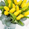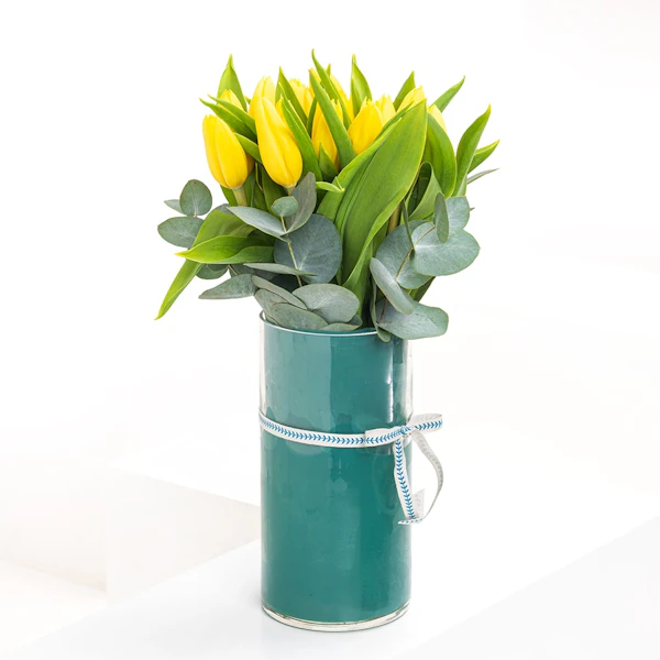 يعتبر التوليب الأصفر والأوكالبتوس الأخضر في مزهرية زجاجية أسطوانية مع غلاف أخضر ترتيبًا جميلًا يجمع بين جمال الطبيعة وأناقتها. يتناقض الزنبق الأصفر مع أوراق الأوكالبتوس الخضراء وتعرضها المزهرية الزجاجية بشكل مثالي. يضيف الغلاف الأخضر الرقي. هدية مذهلة أو قطعة ديكور المنزل.