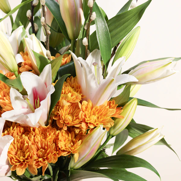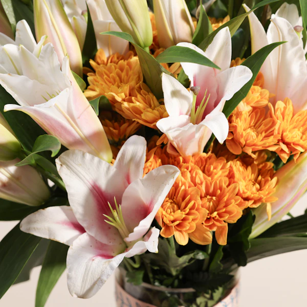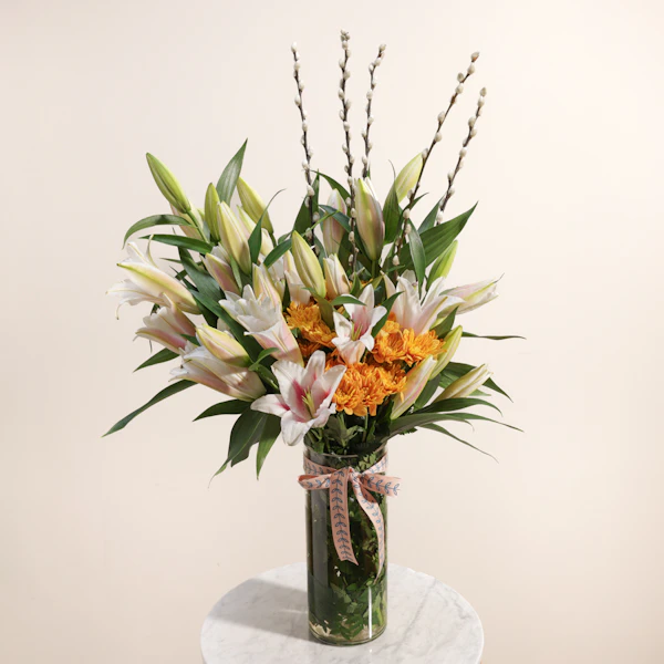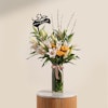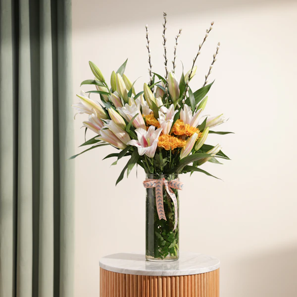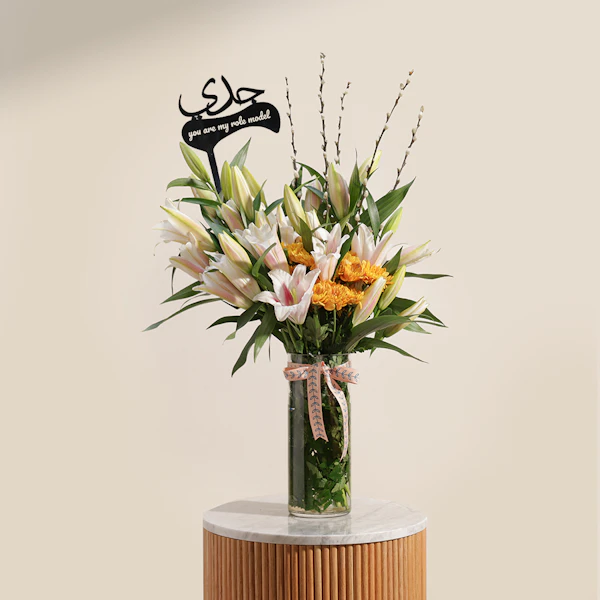 احتفل بحبك وتقديرك لجدي بأجمل طريقة مع فازة زهور "جدي نجم دربي". تحتوي الفازة على زهور الليليوم الوردية الرائعة والأقحوان البرتقالية النابضة بالحياة، تُكمّلها أوراق الصفصاف بشكل أنيق. تقدم هذه الزهور في مزهرية زجاجية كلاسيكية، مزينة بعبارة "جدي أنت مثلي الأعلى"، لتعكس مشاعرك العميقة وتقديرك. اجعل هذه الهدية الخاصة تضيء يومه وتعبّر عن مدى مكانته الكبيرة في حياتك.