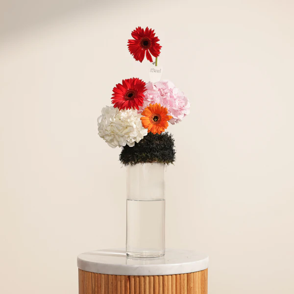 باقة زهور مذهلة تجمع بين جمال جربارة برتقالية وحيوية جربارة حمراء مع لمسة رقيقة من هيدرانجيا وردية وأناقة هيدرانجيا بيضاء. تأتي هذه التوليفة الساحرة في مزهرية أسطوانية زجاجية تضفي لمسة من الفخامة والرقي على أي مكان توضع فيه. تمتع بجمال الطبيعة في أبهى صورها مع هذه الباقة الرائعة التي تمثل الانسجام المثالي بين الألوان والطبيعة. اطلب الآن لتزين منزلك أو مكتبك بهذه الزهور الفريدة، واجعل كل يوم مليء بالبهجة والتفاؤل. لا تفوت فرصة الحصول على هذا الجمال الطبيعي الخلاب.
