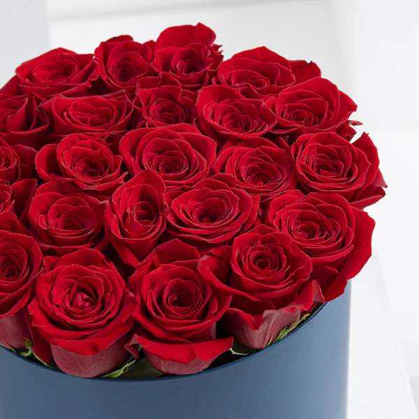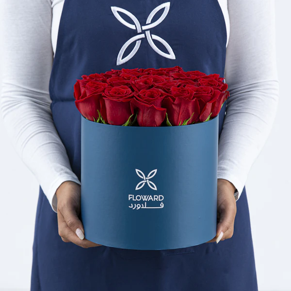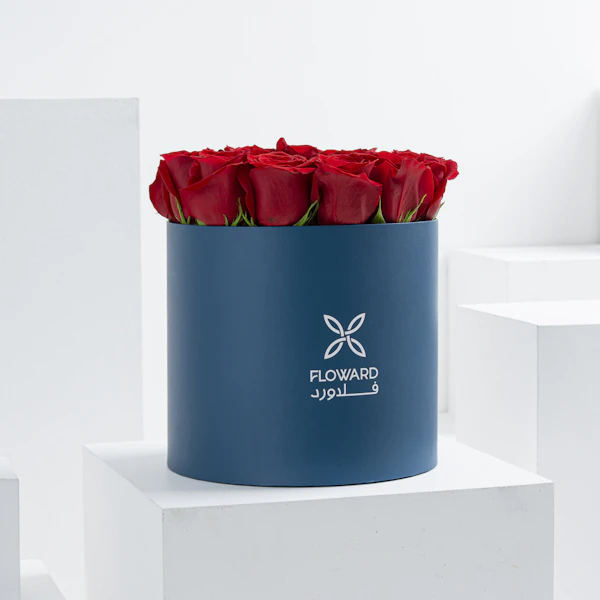 علبة اسطوانية زرقاء أنيقة من الورود الحمراء الجميلة. هذه الباقة المكونة من 25 وردة  جورية حمراء هي اعتراف صريح بالحب الحقيقي والجمال. لون العلبة الأزرق يظهر لون الورود الأحمرالذي ينبض بالحب والعاطفة في عرضًا مبهجًا بصريًا، مما يجعل هذه الباقة هدية رائعة لجميع للمناسبات الرومانسية.