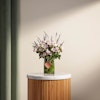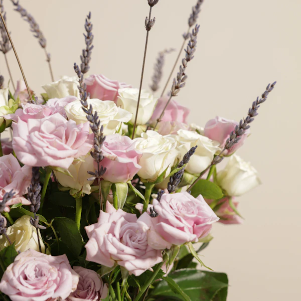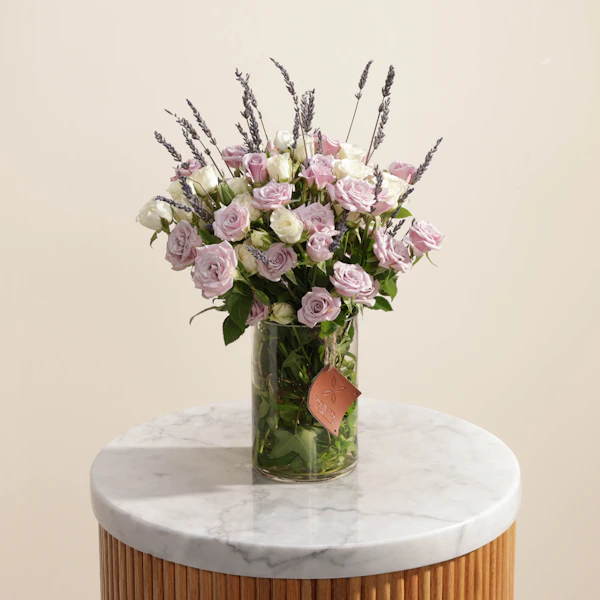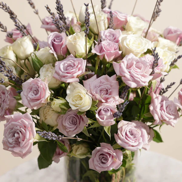 تصميم منعش وبسيط من الزهور البيضاء والأرجوانية لتقديمها لمن تحب. ستحمل هذه الفازة الأنيقة مشاعر الوِّد والمحبة لأحبتك، فهي تتميز بالتناغم بين زهورها رائعة الجمال. فالزهور تم تنسيقها داخل المزهرية بنعومة وأنسيابية لا متناهية تزيد الورود سحراً وجاذبية. هذه المزهرية الجميلة ستكون أضافة رائعة لأي غرفة لما تشعه من جمال والأناقة، مما يجعلها من ألطف ما يمكن ان تقدمه إلى من تحب.