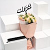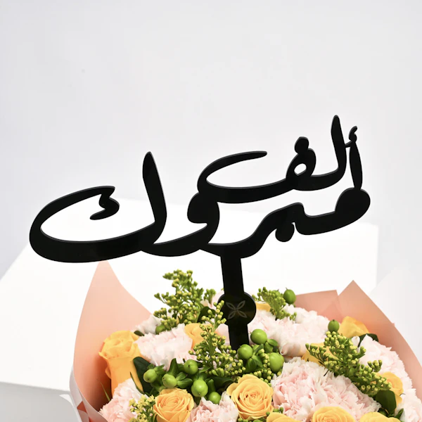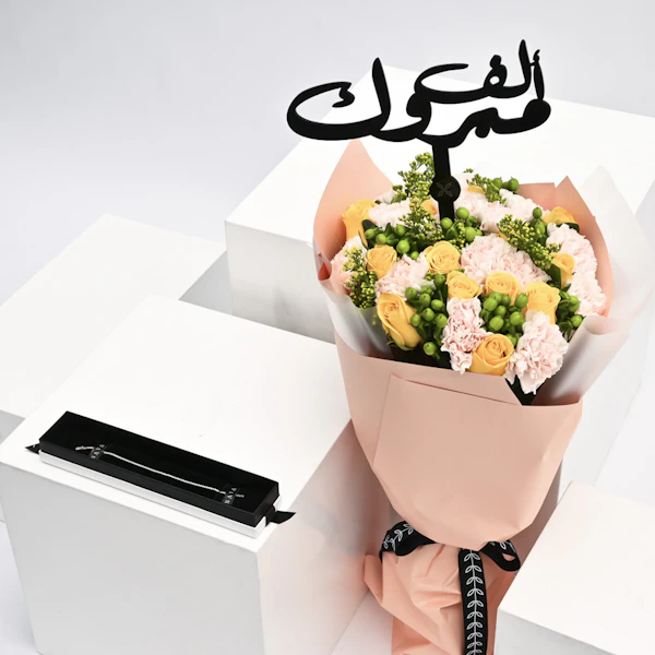 • باقة أزهار ناعمة مُنسقة بزهر القرنفل الوردي، ورد الجوري الأصفر، أزهار الهايبركم الخضراء، أزهار السوليداقو الصفراء بالإضافة الى تغريسة الف مبروك.