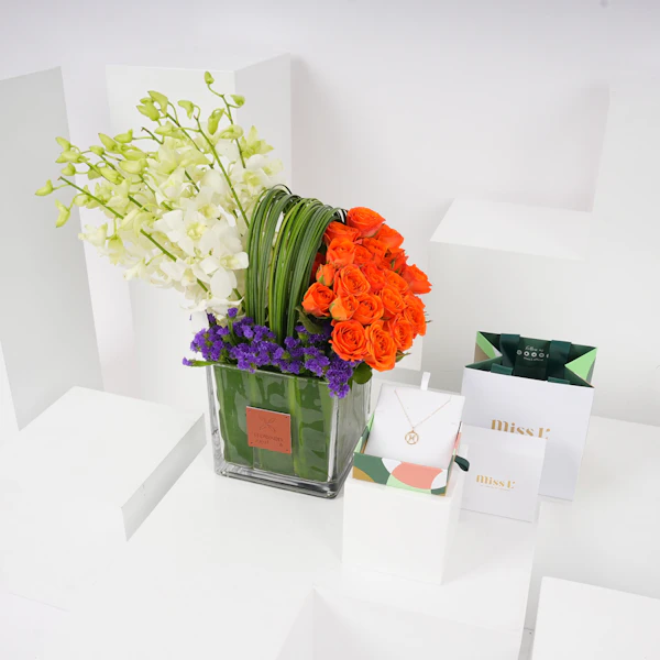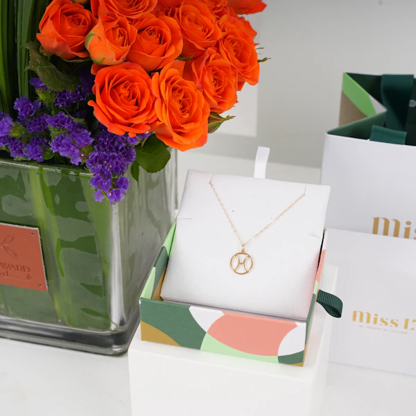 احتفل بأسلوبها الفريد مع هذه الهدية المتناغمة بين قلادة برج الحوت من مس ال من لازوردي تنسيق زهور ساحر من ورود البيبي جوري البرتقالية، والبيبي أوركيد الأبيض، وزهور الستاتيس الزرقاء، والأوراق ذات اللون الأخضر الزاهي، مقدمة بشكل أنيق في مزهرية ربعة. قلادة مس ال من لازوردي لبرج الحوت من الذهب الأصفر مع هذه الباقة الحية هي أكثر من مجرد هدية - إنها تعبير عن امتنانك لأمرأة ذات جمالًا وسحرًا آخاذ.