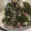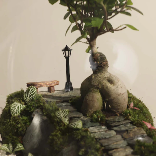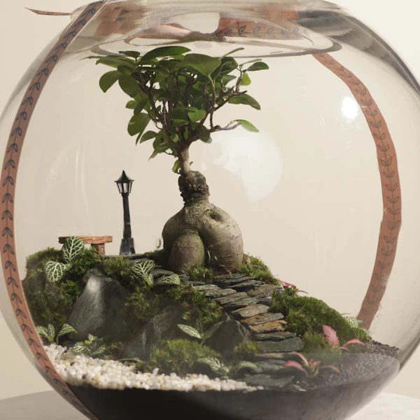 - جرة زجاجية مُنسقة بأحجار زينة على شكل درج، مع كرسي وعامود اضاءة صغير لتعطي منظر خلاب مستوحى من الحدائق الحقيقية، تحتوي الجرة على شجرة البونساي، نبتة الفتونيا باللون الأحمر والأخضر مع الطحالب.