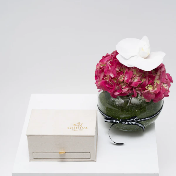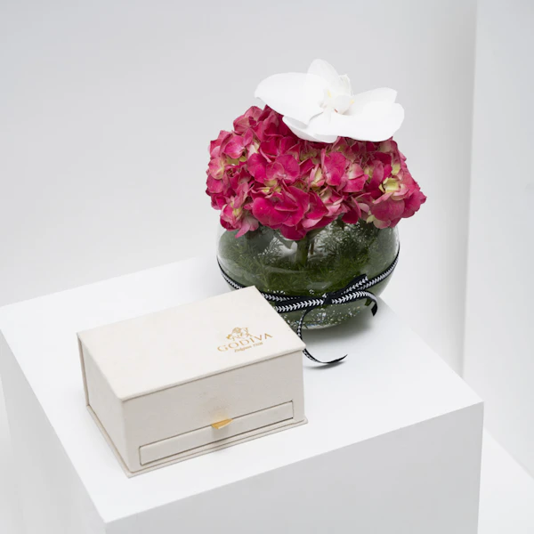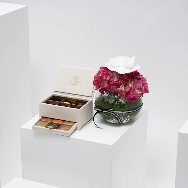 SKU FC37029استمتع بالفاخرة مع صندوق رويال ميني من جوديفا - كنز من الرفاهية والأناقة. افرح بـ 6 برالين وترافلز مميزة من جوديفا، متناغمة مع 12 قطعة لذيذة من جوديفا كاريه. يترافق هذا التجمع الرفيع مع تنسيق رائع من الأوركيد الأبيض وزهرة الهايدرانجيا الفوشيا في مزهرية زجاجية عصرية. انغمس في نكهات الشوكولاتة الرائعة، جنبًا إلى جنب مع روعة الزهور المتفتحة. عليك بترقية حواسك حيث يتلاقى الطعم والجمال في هذا التوليف الرائع.