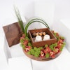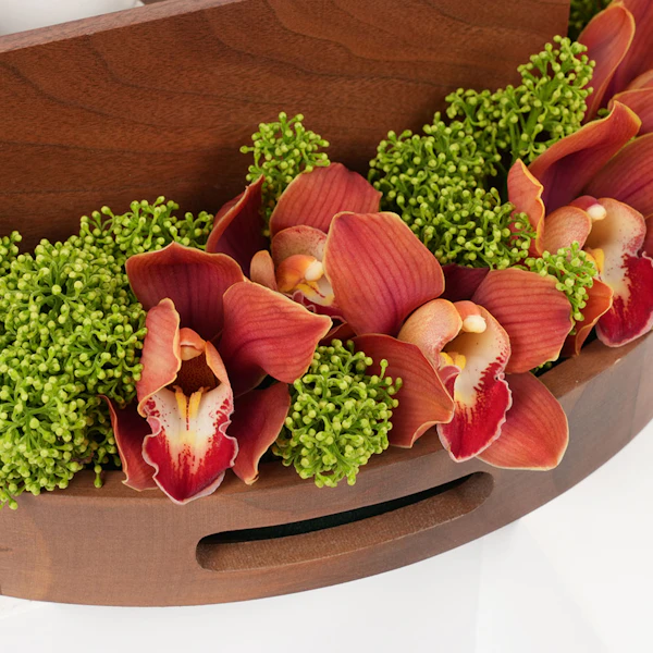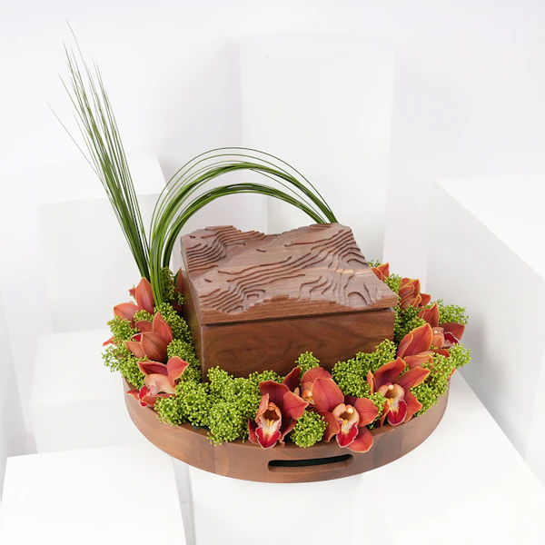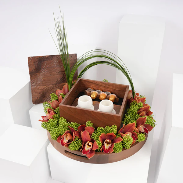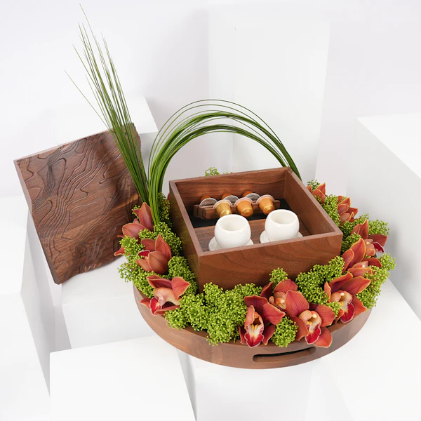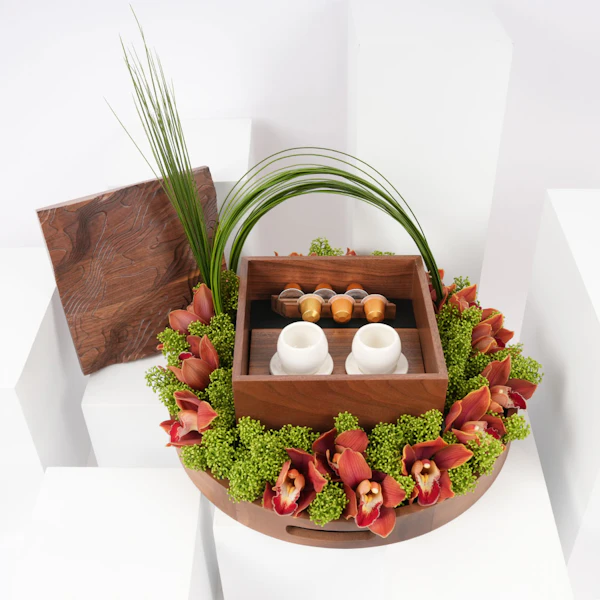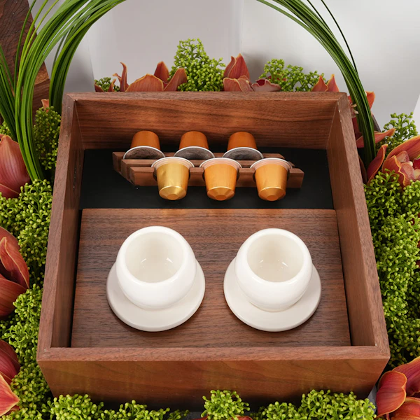 في قلب السعودية تنبض إيقاعات ثقافية عمرها ما عُرف الزمان، تنسج التقاليد في نسيج الحياة اليومية. احتفل بهذا التراث الغني مع هدية فريدة: طقم قهوة مُصمم خصيصًا من شركة حرف السعودية. تخيّل كشف صندوق خشبي محفور بتضاريس جبل طلان، يحتوي على فنجانين مستوحاة من حبوب البن. مع حامل كبسولات يشبه فروع البن، وستة كبسولات قهوة خولاني، وصينية خشبية من خشب الجوز الطبيعي. تتكامل معها ترتيب زهور نابض بالحياة من السمبيديوم البرتقالي والسكيميا الأخضر، مُعَبِّرًا عن أناقة التقاليد السعودية الخالدة.