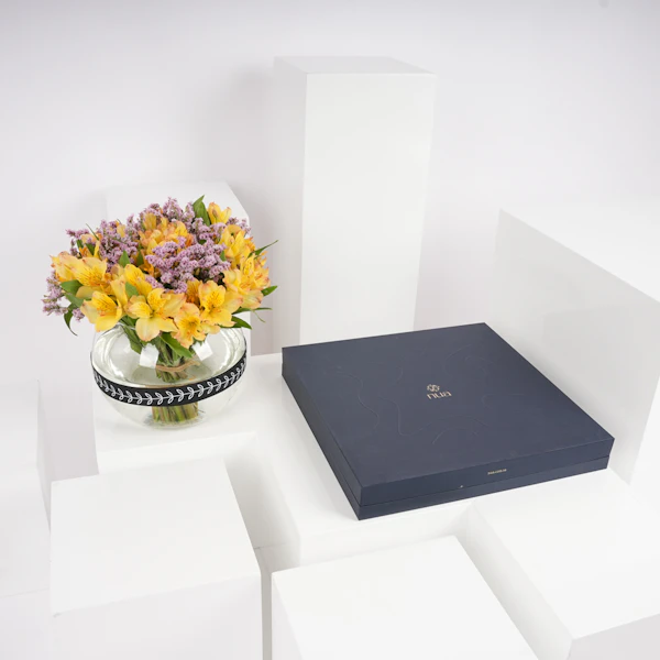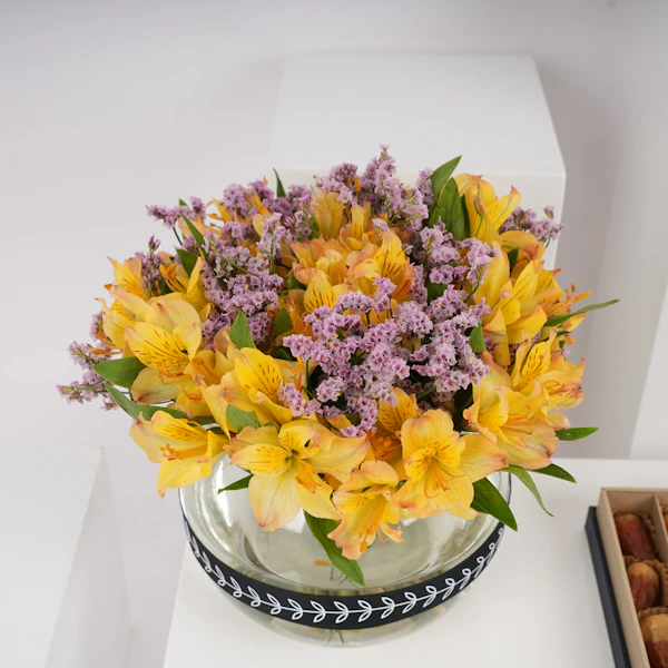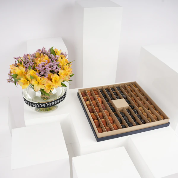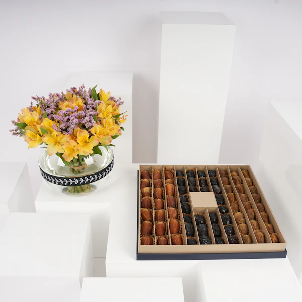 استمتع بتجربة فخمة وأنيقة مع صندوق تمور نوا الفاخر المزين بالألستروميريا الصفراء وأزهار الليمونيوم البنفسجية، مقدمة بأناقة في مزهرية زجاجية. تجمع هذا الهدية الراقية بدقة وأناقة بين أجود أنواع التمور والجمال، وتعدك بتجربة استثنائية حقًا. اكتشف نكهات التمور الغنية والتراث الثقافي للتمور السعودية. أخلق ذكريات عزيزة لا تُنسى مع أحبائك.