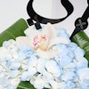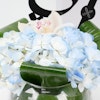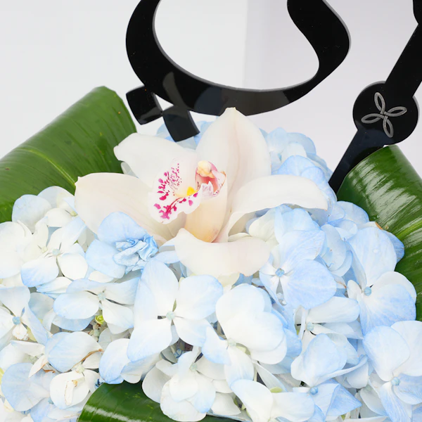 - فازة أزهار زجاجية مستديرة الشكل مُنسقة بزهرة السمبيديم البيضاء، زهرة الهيدرينجا الزرقاء، ورقة الاسبيدسترا الخضراء مع تغريسة تاج راسي.
