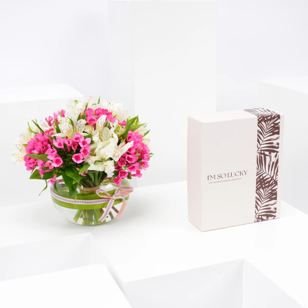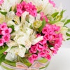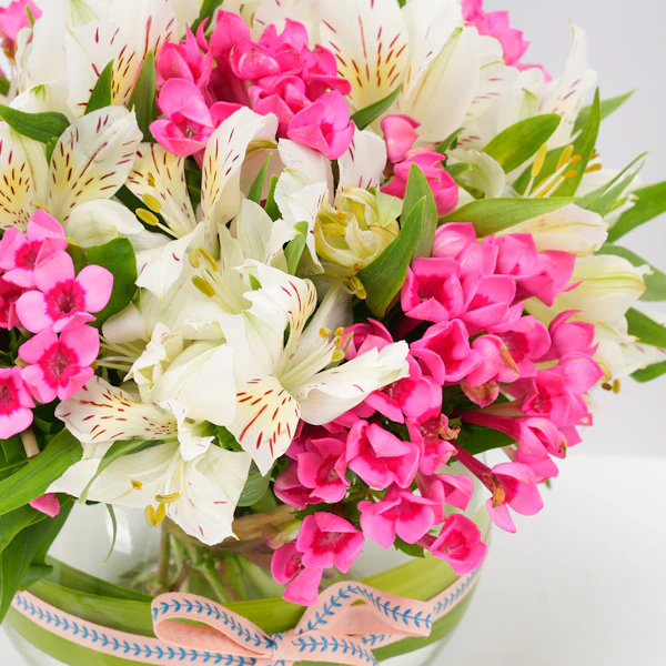 • فازة أزهار زجاجية مستديرة الشكل مُنسقة بأزهار الاستروماريا البيضاء مع أزهار البوفارديا الفوشية.