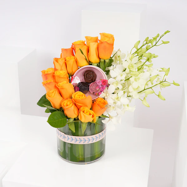 ر.س500علبة الشوكولاتة بستاني هي هدية مبهجة تجمع بين جمال الزهور النضرة وتذوق الشوكولاتة. يتميز هذا الترتيب الأنيق بالجوري البرتقالية النابضة بالحياة وبيبي اوركيد البيضاء الرقيقة المرتبة في مزهرية زجاجية. توجد بجانب هذه الأزهار الرائعة مجموعة مختارة من الشوكولاتة الفاخرة ، مما يجعلها هدية مثالية للمناسبات الخاصة أو لإضفاء البهجة على يوم شخص ما. تمزج هذه المجموعة الساحرة دون عناء حلاوة الشوكولاتة مع رقة فن الأزهار ، مما يخلق هدية لا تُنسى حقًا لأحبائك.