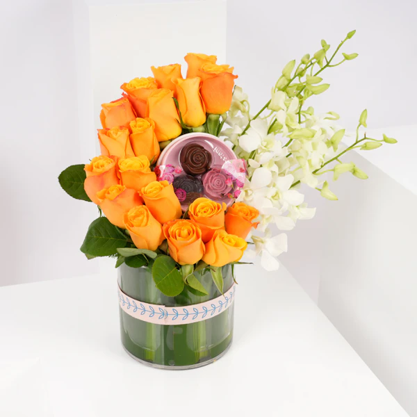 علبة الشوكولاتة بستاني هي هدية مبهجة تجمع بين جمال الزهور النضرة وتذوق الشوكولاتة. يتميز هذا الترتيب الأنيق بالجوري البرتقالية النابضة بالحياة وبيبي اوركيد البيضاء الرقيقة المرتبة في مزهرية زجاجية. توجد بجانب هذه الأزهار الرائعة مجموعة مختارة من الشوكولاتة الفاخرة ، مما يجعلها هدية مثالية للمناسبات الخاصة أو لإضفاء البهجة على يوم شخص ما. تمزج هذه المجموعة الساحرة دون عناء حلاوة الشوكولاتة مع رقة فن الأزهار ، مما يخلق هدية لا تُنسى حقًا لأحبائك.