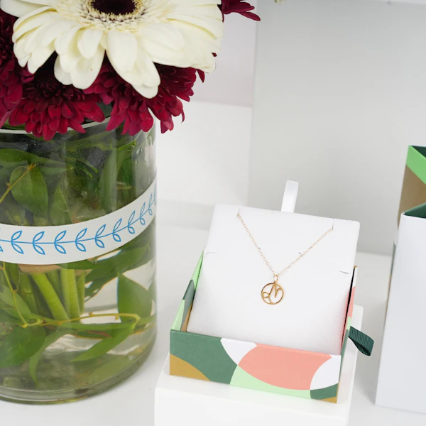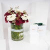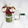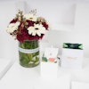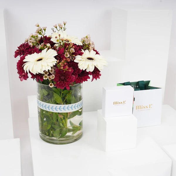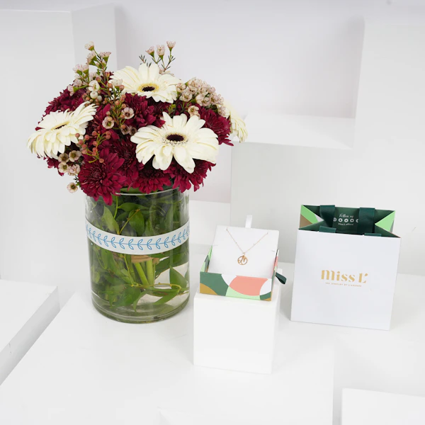 نُسقت هذه الهدية الأنيقة بكل حب وعناية لتضيف البهجة لمناسباتكم السعيدة بأي وقت، فهي تحتوي على قلادة برج الجدي والمُصممة بالذهب الأصفر عيار 18 من مجوهرات مس ال المميزة من ماركة لازوردي، بالإضافة الى مزهرية زجاجية مُزينة بمجموعة من الأزهار الرقيقة فهي تحتوي على أزهار الجربارة البيضاء، أزهار الأقحوان الحمراء مع أزهار الواكس البيضاء الناعمة.