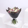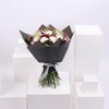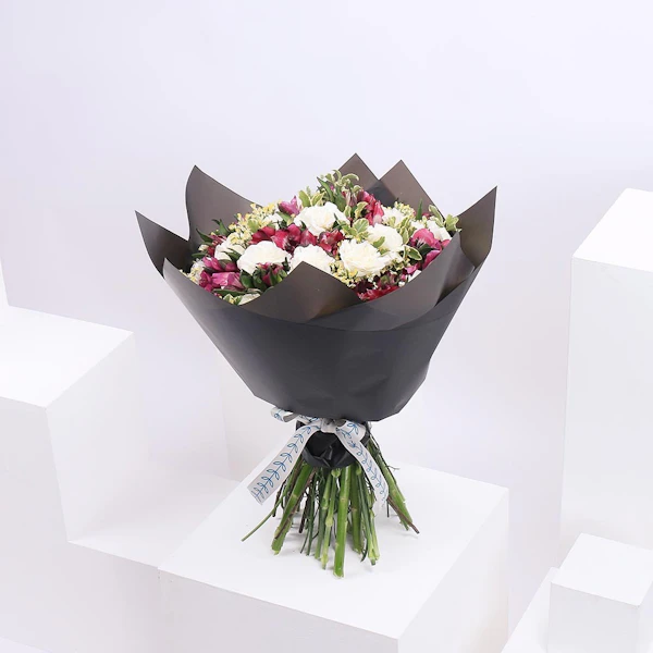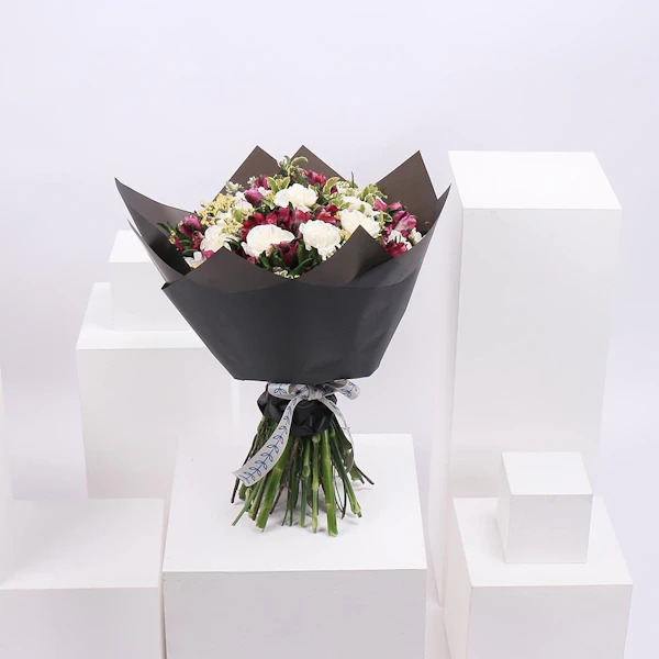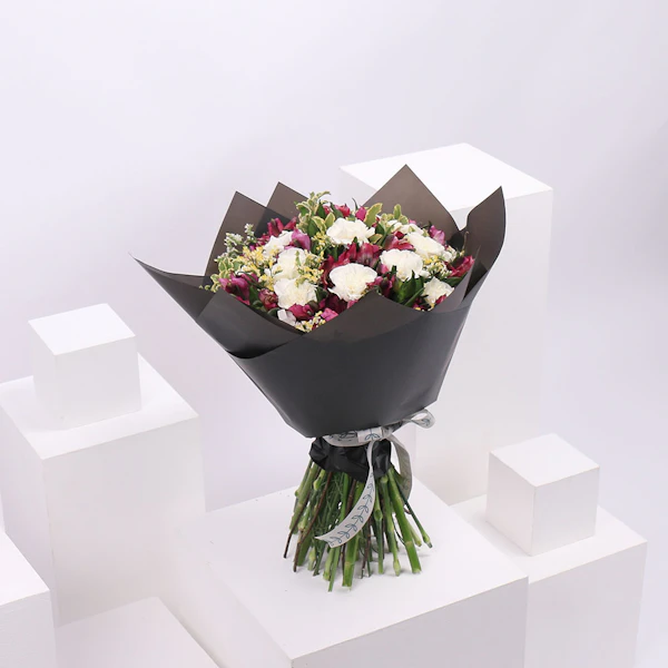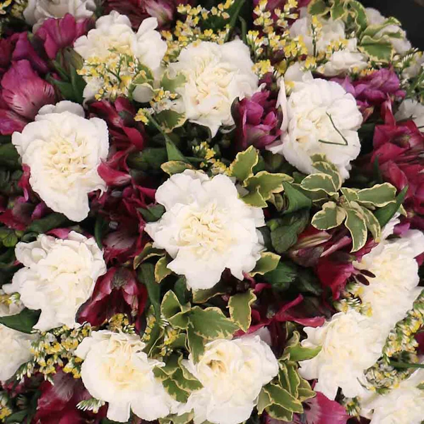 باقة تحتوي على زهور الكارنيشن الابيض والاستروميرا ذات اللون البنفسجي