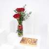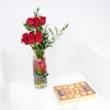 تنسيق يحتوي على زهور الجوري الاحمر وشوكلاته من بستاني من اختيارك