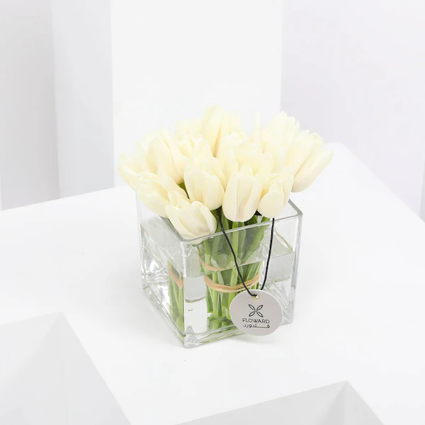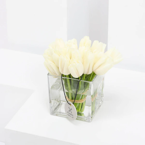 20 توليب أبيض في مزهرية مربعه