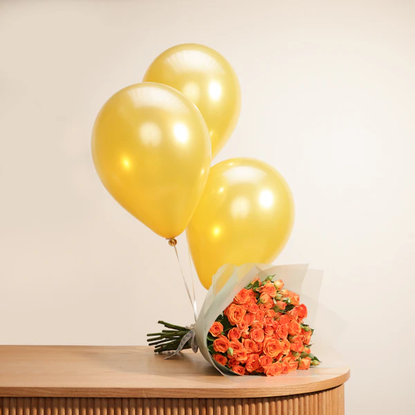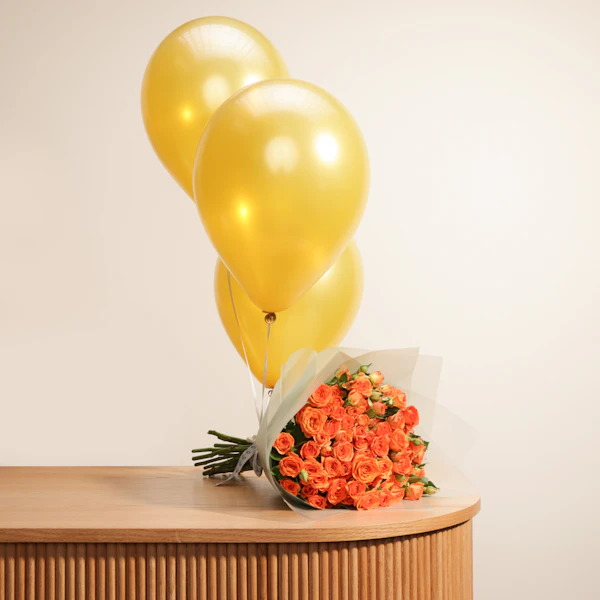 اجعل مناسبتك الخاصة تتألق مع باقة زهور بألوانك المفضلة، مزينة ببالونات برتقالية تضفي لمسة من الفرح والحيوية. أضف عود تزيين يحمل رسالة خاصة لتعبر عن مشاعرك بلمسة فريدة ومميزة. هذه الهدية المثالية تجمع بين الأناقة والاحتفال، لتجعل لحظاتك السعيدة أكثر بهجة وإشراقًا. اخترها لتضفي جمالًا وحيوية على أي مناسبة خاصة.