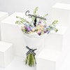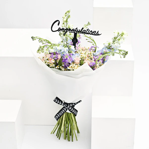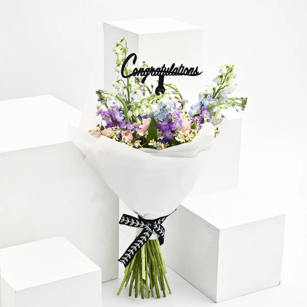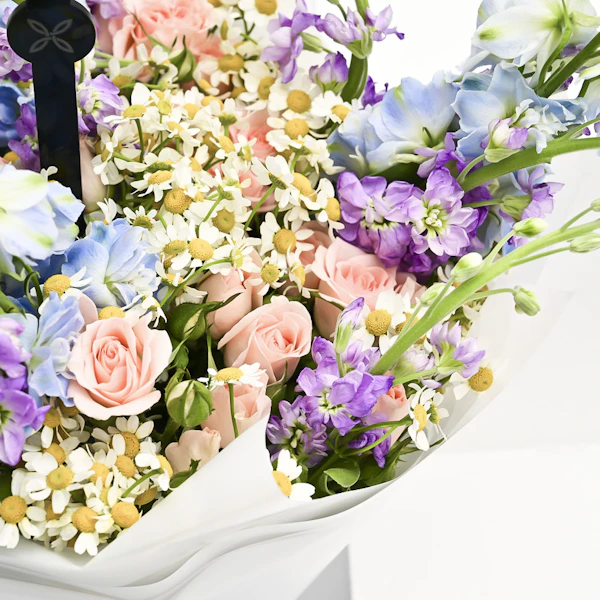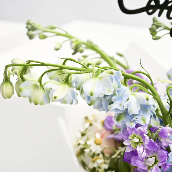 - باقة أزهار أنيقة مُنسقة بأزهار الديليفينوم الزرقاء، أزهار البابونج، ورد جوري سويت سارة الصغير وأزهار الماثيولا البنفسجية. مع تغريسة الف مبروك