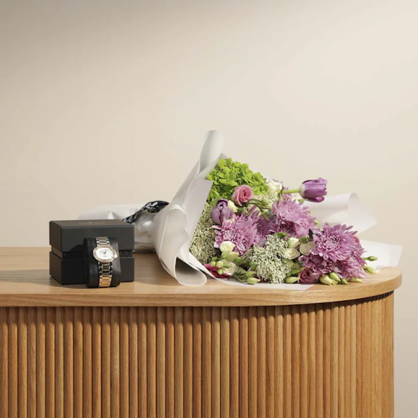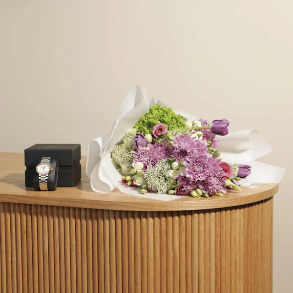 اضف لمسة من الأناقة والتألق إلى إطلالة أحبائك مع ساعة أفاليري بريستيج النسائية، التي تجمع بين التصميم الفاخر والجمال الراقي. تتميز هذه الساعة بسوار مميز من الماس والستانلس ستيل باللونين الذهبي والفضي، مع مينا أبيض يضفي لمسة من الأناقة والرقي. ولإضافة لمسة من الجمال الطبيعي والرومانسية، يأتي مع الساعة اقحوان وردي، وتوليب بنفسجي، واستوما وردي، وجوري أبيض، مرتبة بعناية في غلاف أبيض، مما يجعل هذه الهدية الراقية تعبيرًا مثاليًا عن مشاعر الحب والتقدير.