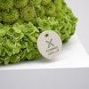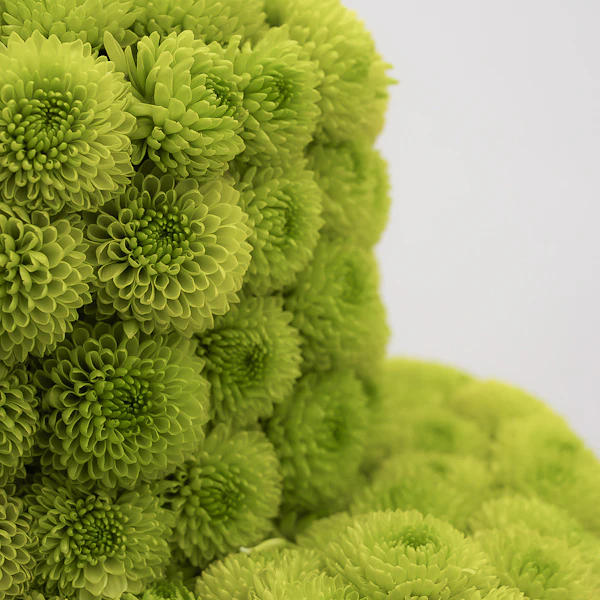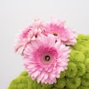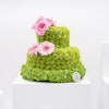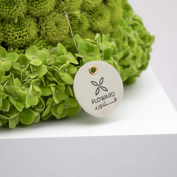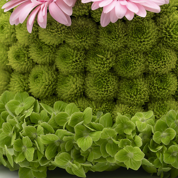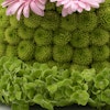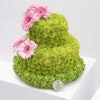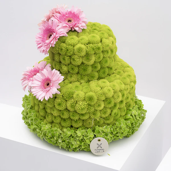 - مجسم أزهار طبيعية على شكل كيكة، مُنسق بمجموعة من أزهار الأقحوان الخضراء، أزهار الهيدرينجا الخضراء مع أزهار الجربارة الوردية.
