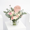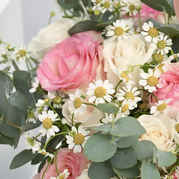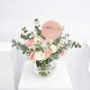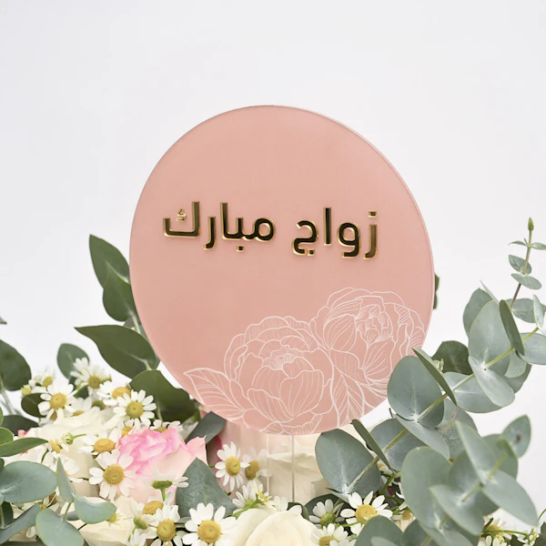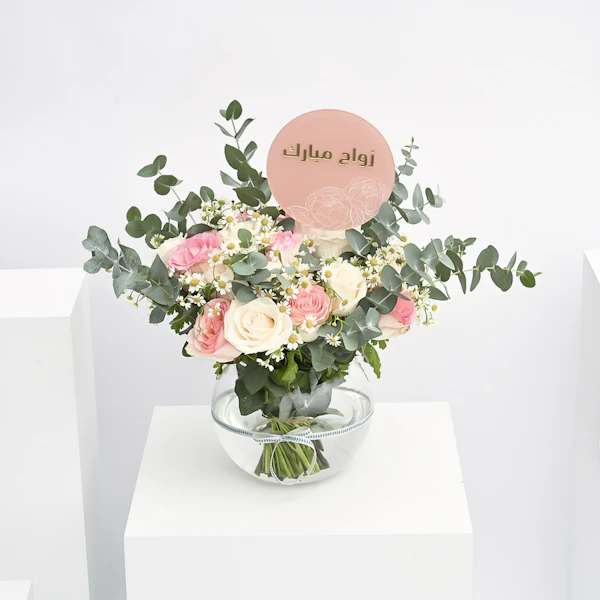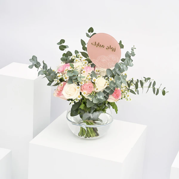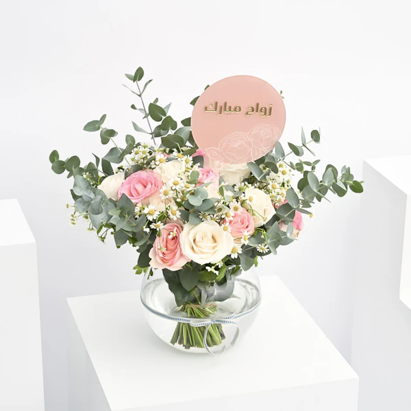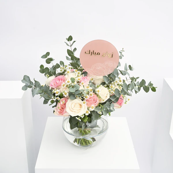 - فازة أزهار زجاجية مستديرة الشكل مُنسقة بورد الجوري الأبيض، ورد جوري الاسبرانس، أزهار البابونج، اليوكالبتس مع تغريسة زواج مبارك.
