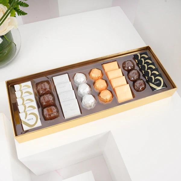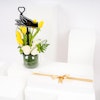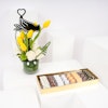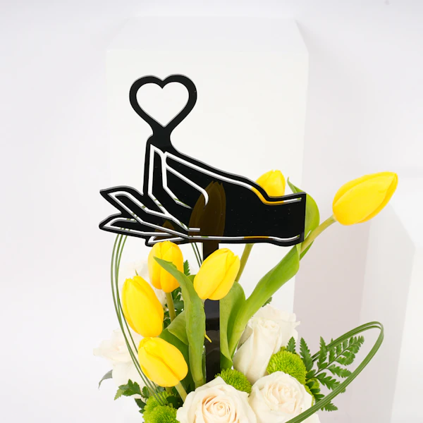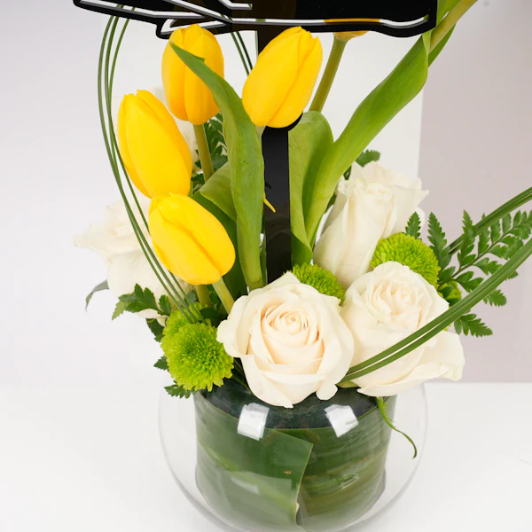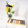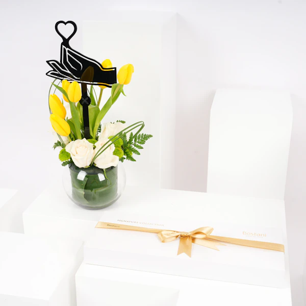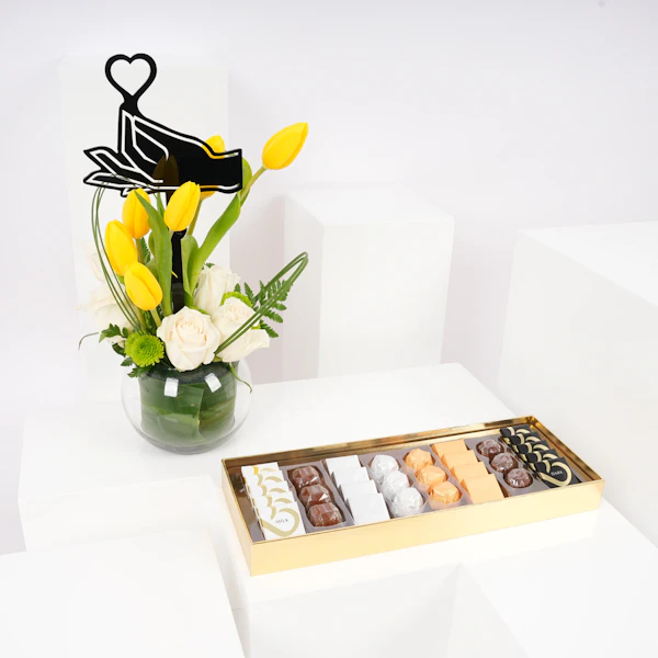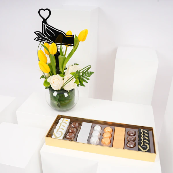 استمتع بفخامة علبة الشوكولاتة المميزة البيضاء من بستاني، التي تحتوي على 30 قطعة من الشوكولاتة اللذيذة والمتنوعة النكهات. هذه الصندوق الأبيض الفاخر هو كنز من النكهات اللذيذة، مما يجعله الهدية المثالية لأي مناسبة. وترافق هذه اللذيذة زهور جميلة في مزهرية زجاجية مستديرة تتألق بتوليب صفراء، ورد أبيض، وأقحوان أخضر، وأوراق ليذر خضراء، وقرطاس من الصلب مع تغريسة بشكل قلب، مما يضيف لمسة إضافية من الأناقة إلى هذه الهدية الرائعة.