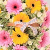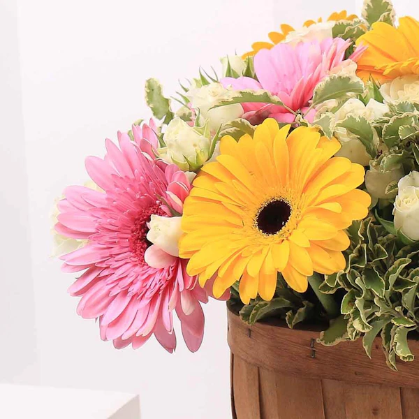 الورد طريق للقلب. اهدي هذه التنسيقه من الجوري الصغير ذو اللون الابيض والجربيرا الصفراء والزهريه الجميلة لأحبابك للتعبير عن مشاعرك.