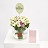 - فازة أزهار زجاجية مستديرة الشكل مُنسقة بورد الجوري البنفسجي، ورد الجوري الصغير الأبيض مع تغريسة عيد ميلاد سعيد باللغة الإنجليزية.