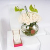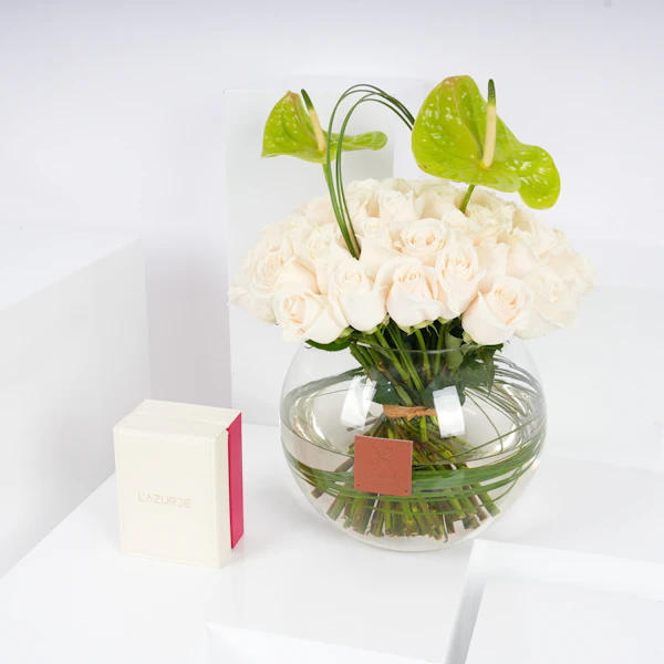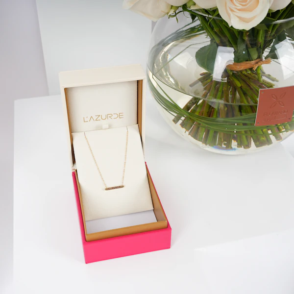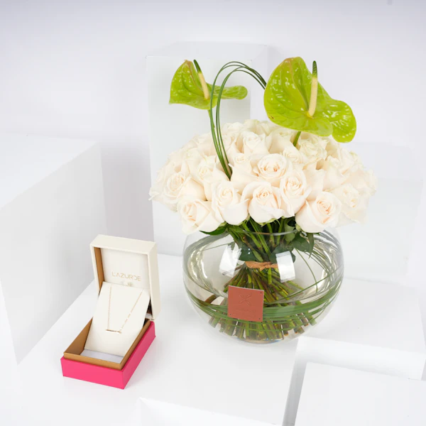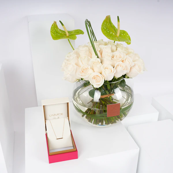 استمتعي بسحر الهدايا مع قلادة ذهبية رائعة من لازوردي ، وهي تجسيد متألق للفخامة مصنوعة من الذهب عيار 18 قيراط - وهي شهادة لامعة على الأناقة الخالدة. تصاحب هذه الزينة الفاخرة سيمفونية نباتية ورقصة متناغمة من ألجوري البيضاء والجاذبية الغريبة لنبات الأنثوريوم الأخضر الموجود في مزهرية زجاج رقية. بينما تزين القلادة الرقبة بلمسة من الروعة، فإن مجموعة الأزهار تضيف لمسة من الجمال الطبيعي إلى أي مساحة. هذه ليست مجرد هدية. إنه احتفال بالرقي، حيث يلتقي لمعان الذهب بنعمة الزهور الرقيقة، مما يخلق لحظة يتردد صداها مع البذخ وسحر الطبيعة الخالد - وهو نسيج من الفخامة والشعر النباتي.