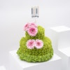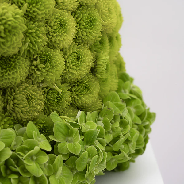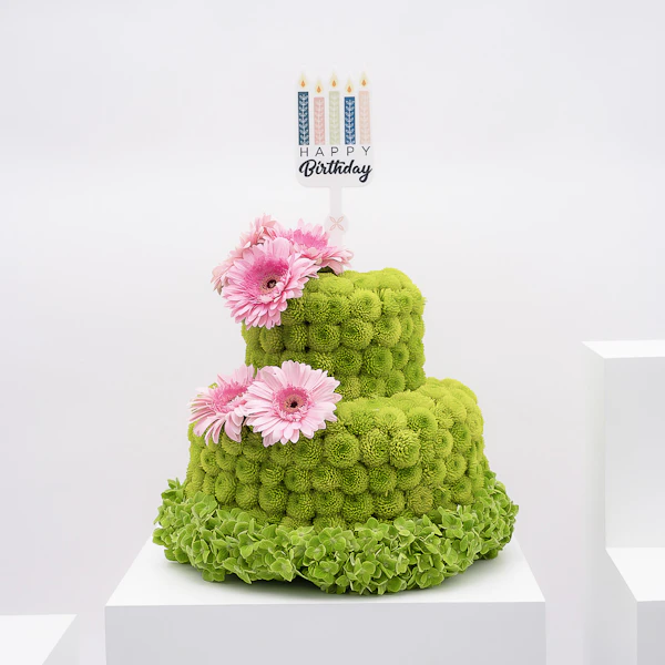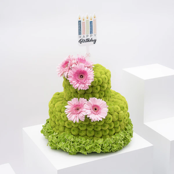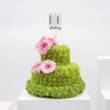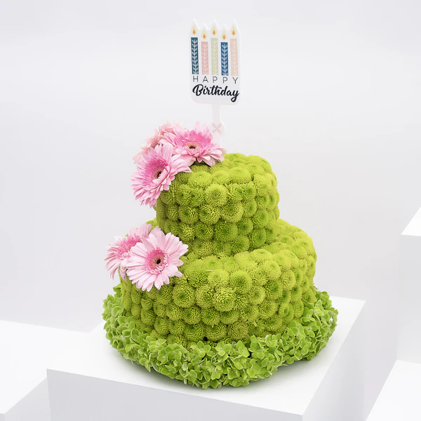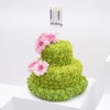 • مجسم أزهار طبيعية على شكل كيكة، مُنسق بمجموعة من أزهار الأقحوان الخضراء، أزهار الهيدرينجا الخضراء مع أزهار الجربارة الوردية بأضافة تغريسة شموع العيدميلاد.