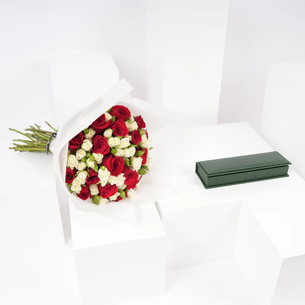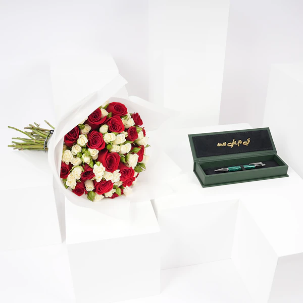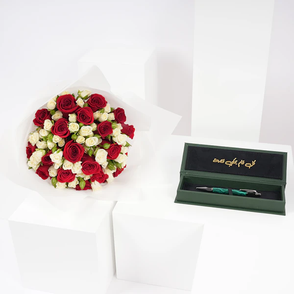 اكتشف جوهر الجمال والإلهام مع قلم من حجر المالاكايت الأخضر قلم سين من بالقلم وترتيب الزهور الرائع. قلم المالاكايت هو عمل فني بحد ذاته، مزين بظلال خضراء تعكس ثراء الحياة. مكملًا لجماله، باقة من الورود الجورى الحمراء وورود بيبي جورى الأبيض، محاطة بتغليف أبيض نقي، تبث حبًا وعاطفة. هذه الهدية تتجاوز المألوف، مما يجعلها اختيارًا مثاليًا لأولئك الذين يقدرون الأشياء الأرقى في الحياة. سواء كانت رسالة مؤثرة أم لحظة عزيزة، يتحدث هذا الثنائى عن ذوقك ومشاعرك.