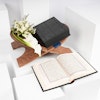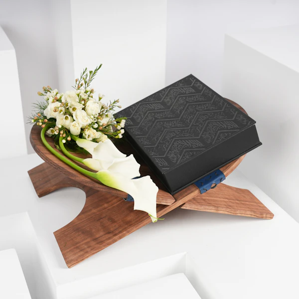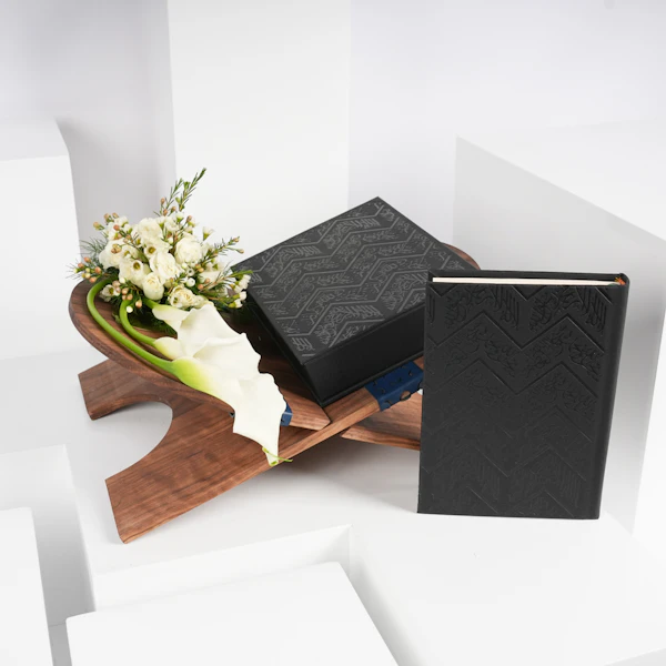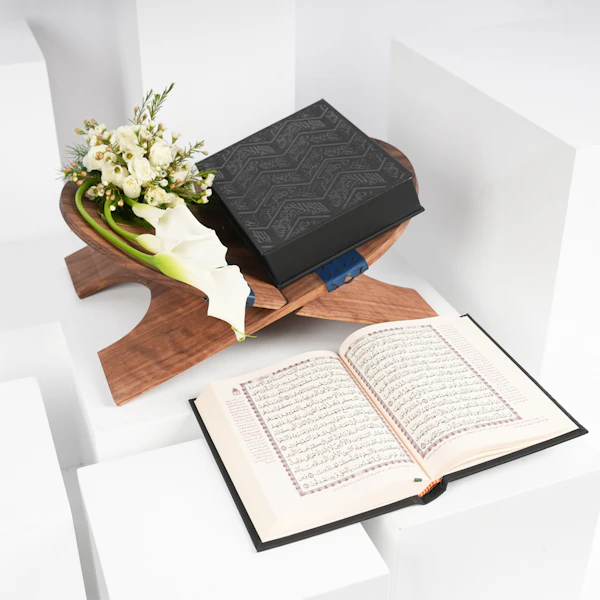 الأسعار شاملة الضرائبقرآن كريم أسود مع حامل خشبي | الأزهار البيضاء