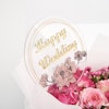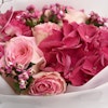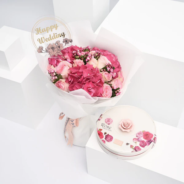 - باقة أزهار ناعمة مُنسقة بورد جوري الاسبرانس، أزهار الهيدرينجا الفوشية، أزهار البوفارديا الفوشية مع تغريسة زواج سعيد باللغة الإنجليزية.