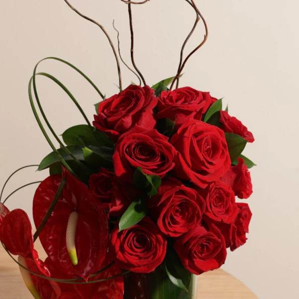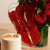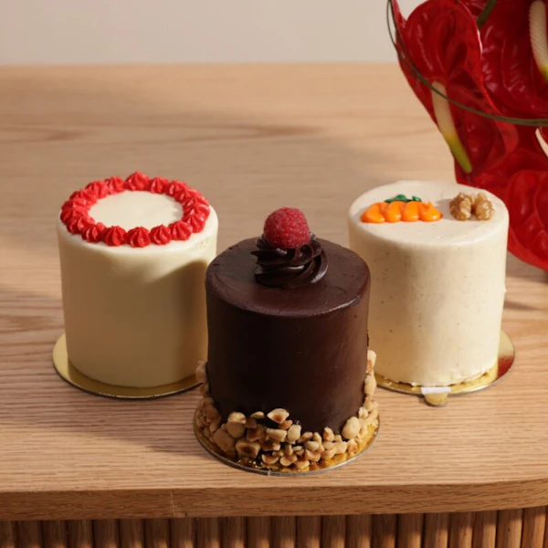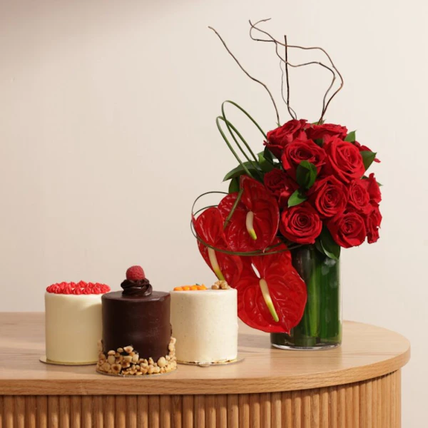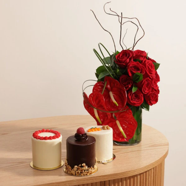 احتفل باللحظات الخاصة مع هذه الهدية الشهية والجميلة من روز ريبن. استمتع بمجموعة ميني كيك متنوعة تتضمن كيك الشوكولاته، وكيك الريد فيلفيت، وكيك البامبكين، حيث تكفي كل قطعة لشخصين. ولإضافة لمسة من الجمال والأناقة، يأتي معها ترتيب زهور يتكون من جوري أحمر وأنثوريوم أحمر، مقدم في مزهرية زجاجية أنيقة واسطوانية. هذه الهدية المميزة ستجلب البهجة والسرور لأي مناسبة، مهما كانت صغيرة أو كبيرة، وستضفي لمسة من الفخامة والرومانسية على تلك اللحظات الخاصة.