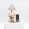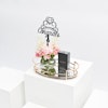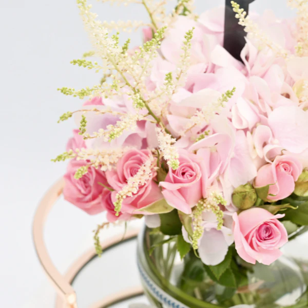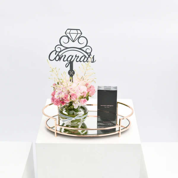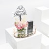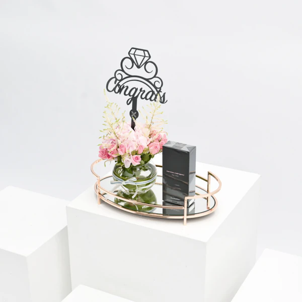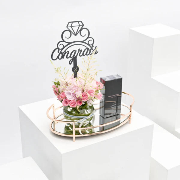 • صينية مُنسقة بفازة أزهار زجاجية تحتوي على ورد الجوري الصغير الوردي، أزهار الاستلبي الوردية، زهرة الهيدرينجا الوردية مع تغريسة مبروك باللغة الإنجليزية.