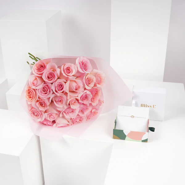 SKU FC42198نُسقت هذه الهدية الأنيقة بالتعاون مع مجوهرات بلسينجز من مس ال وفريقنا المبدع بتنسيق الأزهار لتكون الهدية المثالية لمناسباتكم السعيدة.