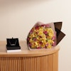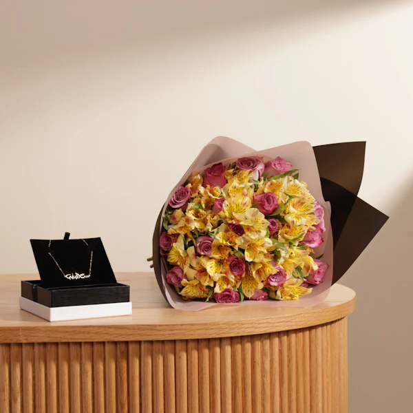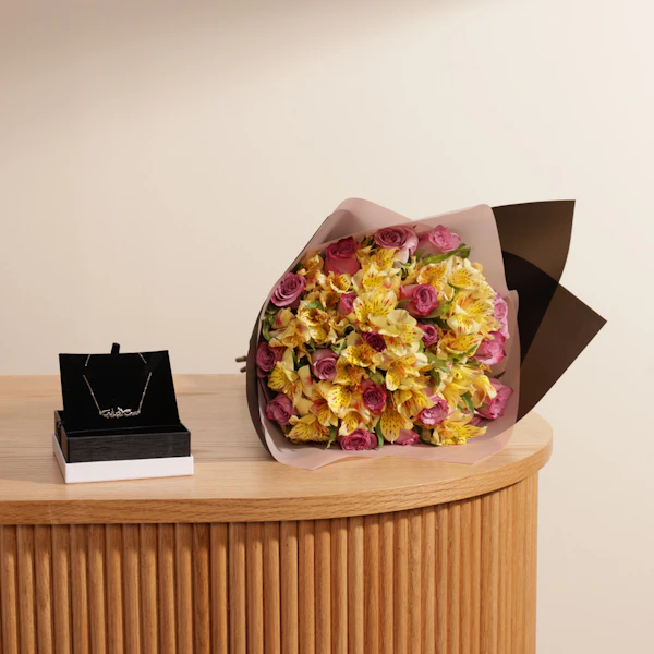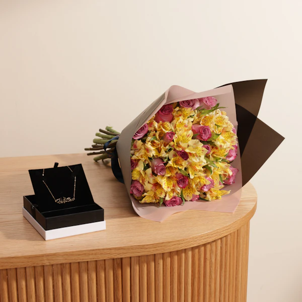 SKU FC78282أخبر والدتك بمقدار حبك وتقديرك لها بألطف وأرقى الطرق مع قلادة 'ست الحبايب' من مجوهرات نافا. هذه القطعة الفريدة ليست مجرد هدية؛ بل هي رمز للامتنان للأم الرائعة في حياتك. لا يوجد قلب يشبه قلب الأم، ولا يوجد حب يُقارن بحبها. فاجئي أمك الرائعة بهذه الهدية المميزة، وعبّر عن حبك لأعز قلب في العالم! وللمزيد من الحب والاهتمام، تأتي القلادة مع باقة من الجوري البنفسجية وزهور الألستروميريا الصفراء الساحرة.