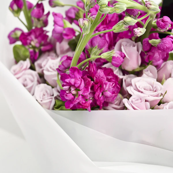 باقة الماتيولا الفوشيا والبيبي جوري الأرجواني في غلاف أبيض عبارة عن ترتيب زهور مذهل ومثالي لأي مناسبة. تحتوي هذه الباقة الجميلة على 10 ماتيولافوشيا  و 20 بيبي جوري أرجواني مغلفة بأناقة بورق أبيض مع تغريسة التخرج