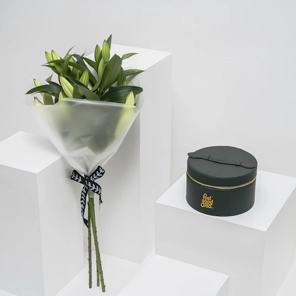 ر.س499أبهج قلب من تحب بلذة عالم الشاي الرائع من فيل قود تي، حيث يحمل صندوق الجلد الراقي تشكيلة متنوعة من نكهات الشاي العشرة. دع أحبابك يستمتعون بنكهة الكيوي المنعشة، وسحر الفانيليا الفرنسية الناعمة، وفوائد شاي التنحيف، وانتعاش النعناع، ونكهة عصير الليمون المنعشة بالزنجبيل، وهدوء البحر الأزرق الساحر، واللذة الاستوائية مع البينا كولادا، ونكهة صباح الخير، وروعة الشاي الأبيض الرقيق، ونكهة ايرل قراي تويست الفريدة. يحتوي هذا الصندوق أيضًا على كوب زجاجي مصمم بمصفاة مدمجة، مما يضمن تجربة راحة وسهولة في شرب الشاي. ولإضفاء مزيد من الجمال على هذه الهدية الأنيقة، زُينت ببباقة ناعمة مُنسقة بثلاثة أزهار من أزهار الليلوم البيضاء.