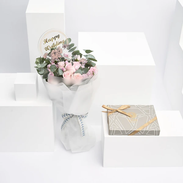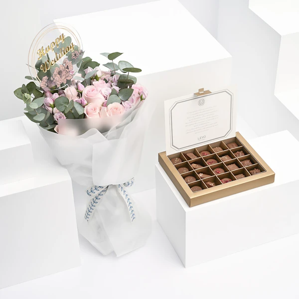 نُسقت هذه الهدية الأنيقة بالتعاون مع ليفو للشوكولاتة وفريقنا المبدع بتنسيق الأزهار لتكون الهدية المثالية لمناسبات الزواج السعيدة.