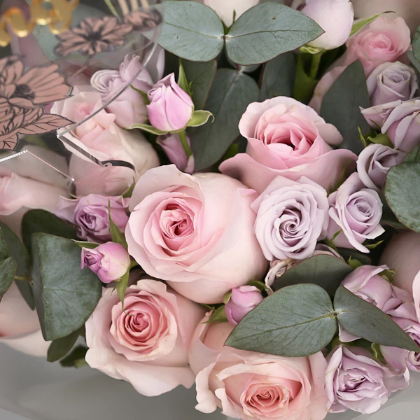 • باقة أزهار ناعمة مُنسقة بورد الجوري الصغير البنفسجي، ورد الجوري الوردي الفاتح، اليوكالبتس مع تغريسة زواج سعيد باللغة الإنجليزية.