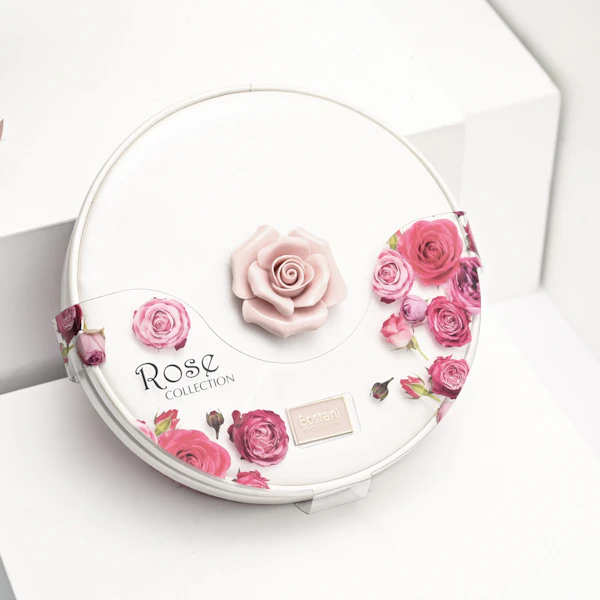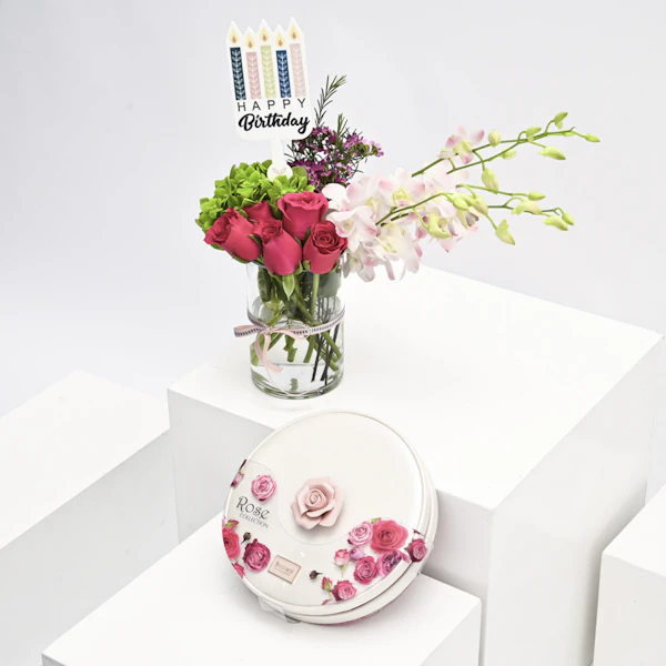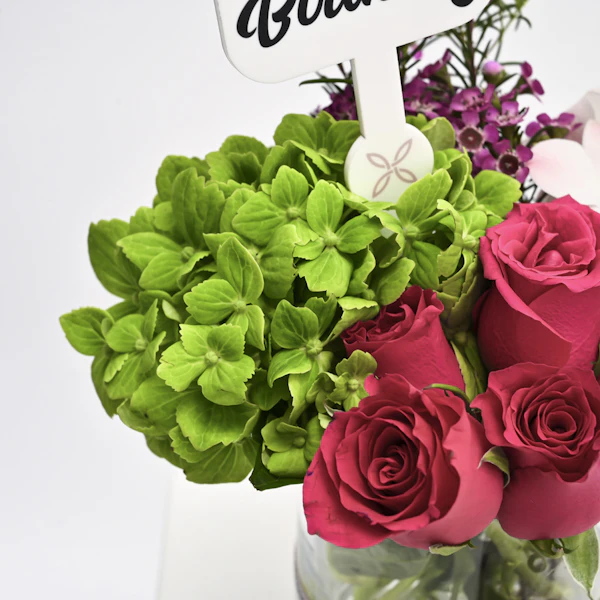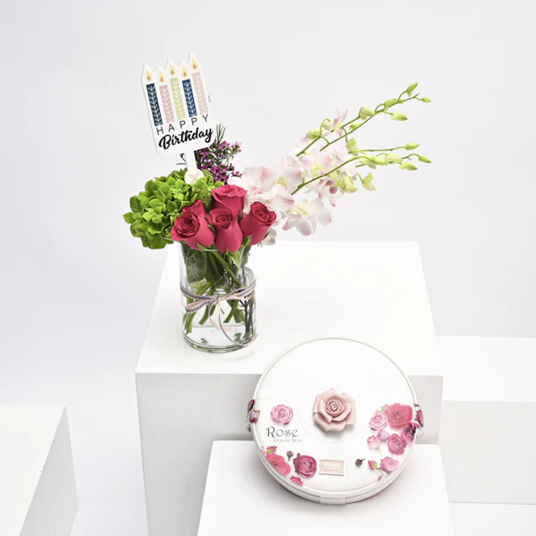 تنسيق مزهرية يحتوي على الهيدرينجيا الخضراء والبيبي اوركيد الزهري مع الجوري وشوكلاتة بستاني تحتوي على 13قطعة