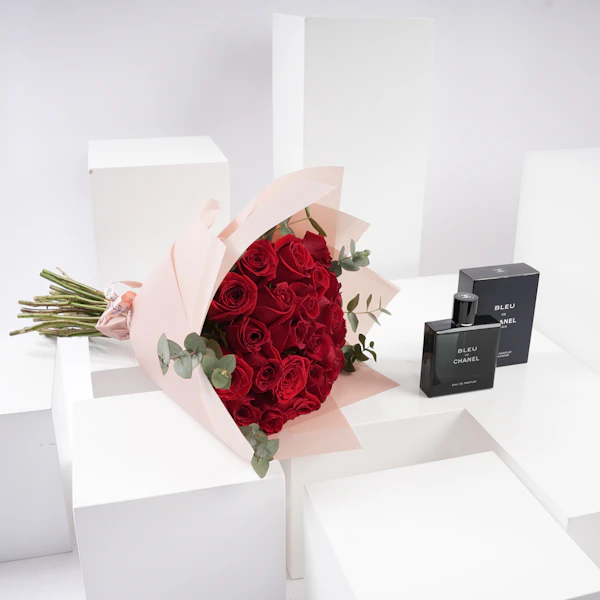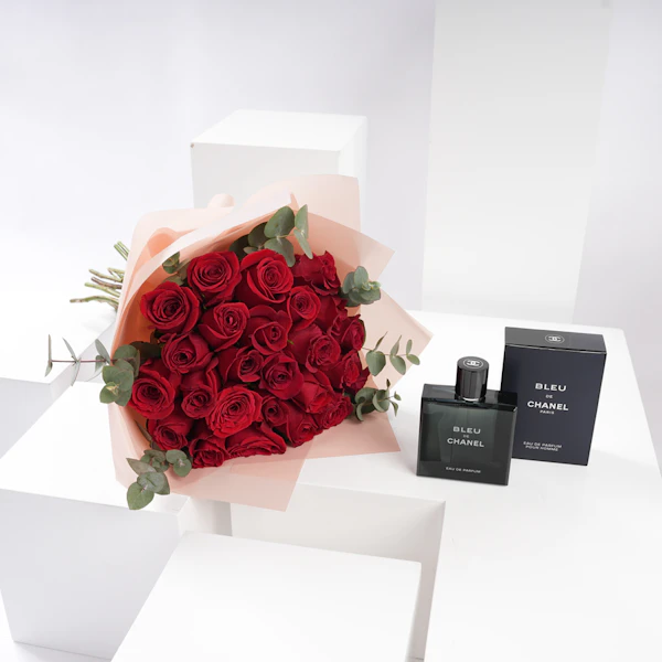 استمتع بجوهر الأناقة الخالدة في يوم الحب هذا مع مجموعة الهدايا الرائعة لدينا. عطر شانيل بلو دي شانيل أو دو بارفان للرجال، مزيج راقي من الروائح العطرية التي تأسر الحواس برقيها وجاذبيتها، مقترنة بباقة فاخرة من الجوري الحمراء . هذا المزيج من العطور الراقية والأزهار الرومانسية هو التعبير المثالي عن الحب والإعجاب، مما يجعله لفتة لا تُنسى حقًا لمن تحب.