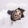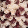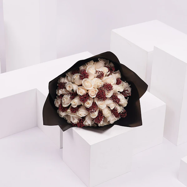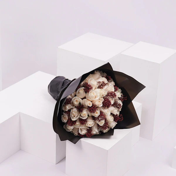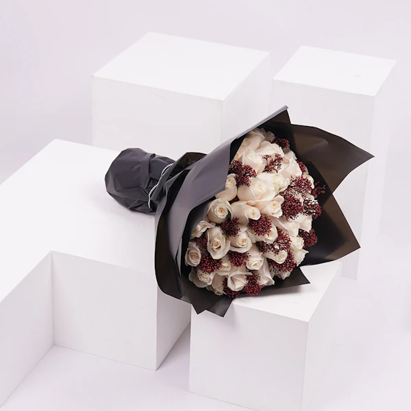 باقة تحتوي على زهور الجوري ذات اللون الابيض مع زهور السكيميا ذات اللون الاحمر